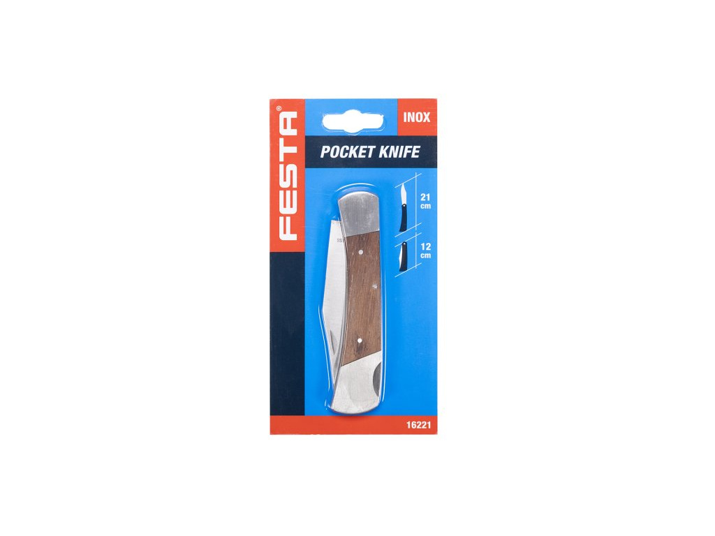 Kapesní zavírací nůž s pojistkou proti samovolnému zavření čepele, čepel z nerezové oceli, dřevěná rukojeť, kvalitní nýtování, délka čepele 120mm, blistr.