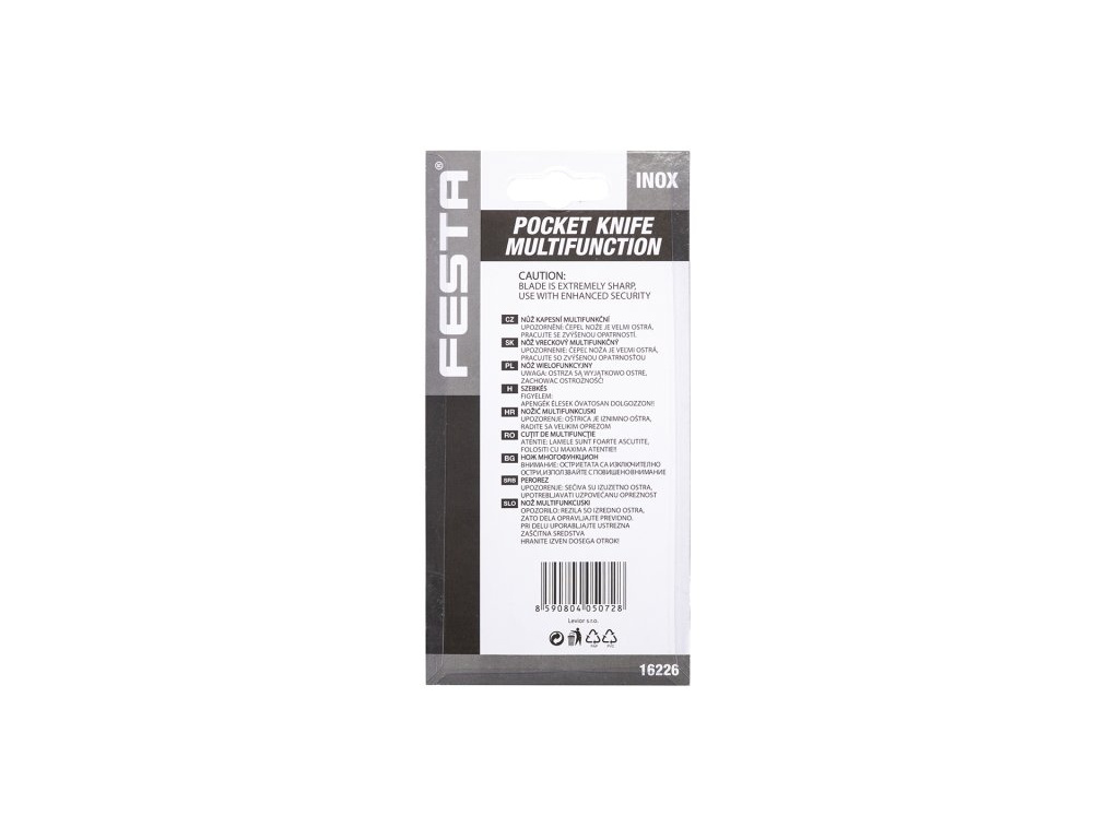 Nůž kapesní multifunkční INOX. Délka zavřeného nože 95 mm. Nerezový multifunkční nůž s 11 různými částmi pro různé způsoby použití. Rukojeť v kombinaci kov - dřevo. Hmotnost 0,666 kg.