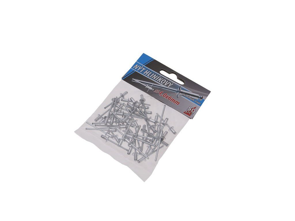 Klasické trhací slepé aluminiové nýty průměr 4,0 mm délka 6 mm v malém balení 50 kusů, vhodné pro malospotřebitele. Instruktážní video Instruktážní video