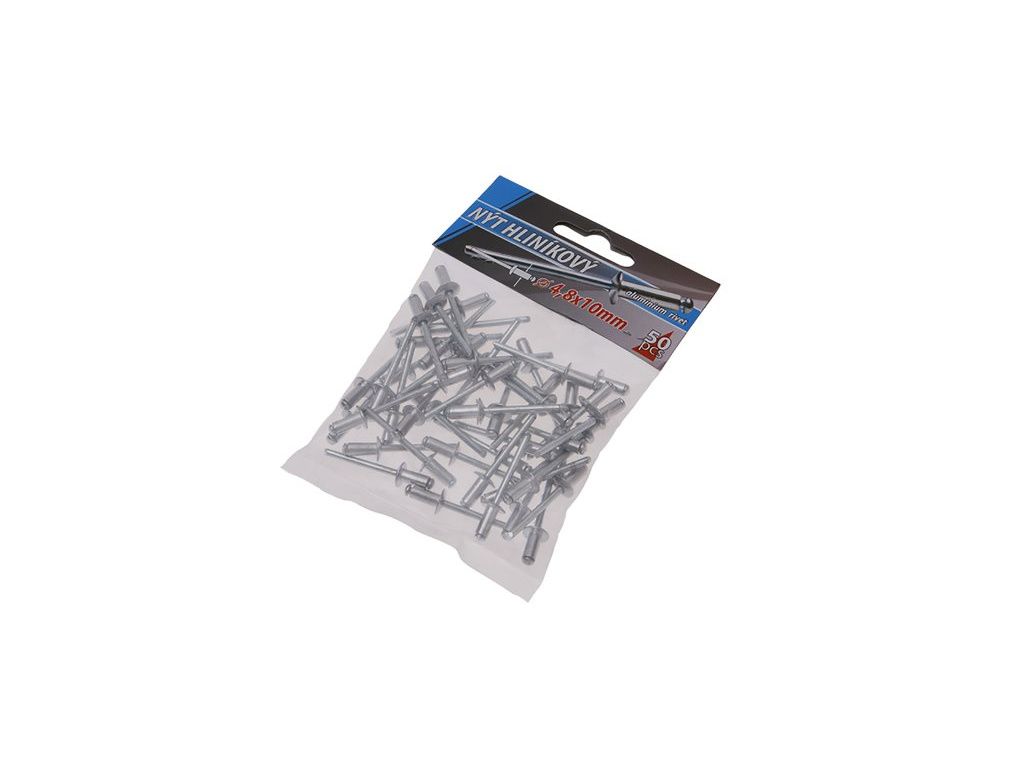 Klasické trhací slepé aluminiové nýty průměr 4,8 mm délka 10 mm v malém balení 50 kusů, vhodné pro malospotřebitele. Instruktážní video Instruktážní video