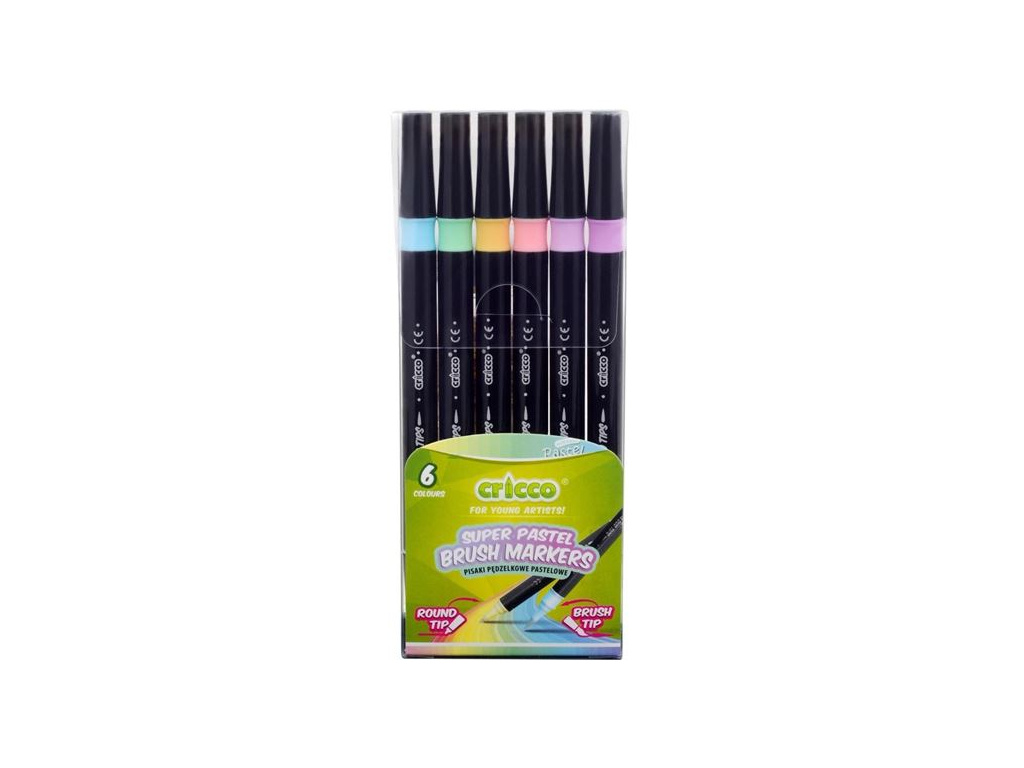 Oboustranná pera Cricco s jemným hrotem ve tvaru fixu a druhým štětcovým hrotemSe syntetickými štětinami pro příjemné a přesné vybarvováníPastelové, jemné barvy jsou ideální pro zdobení různých povrchůSada 6 barev v praktickém plastovém pouzdře