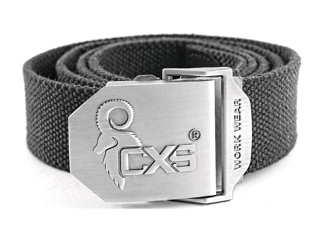 Textilní opasek s kvalitní kovovou sponou s logem CXS, jednoduché patentní zapínání, spona ze slitiny zinku (bez obsahu niklu) pro individuální nastavení délky. Součásti balení je praktický blistr pro prodejní stojany.