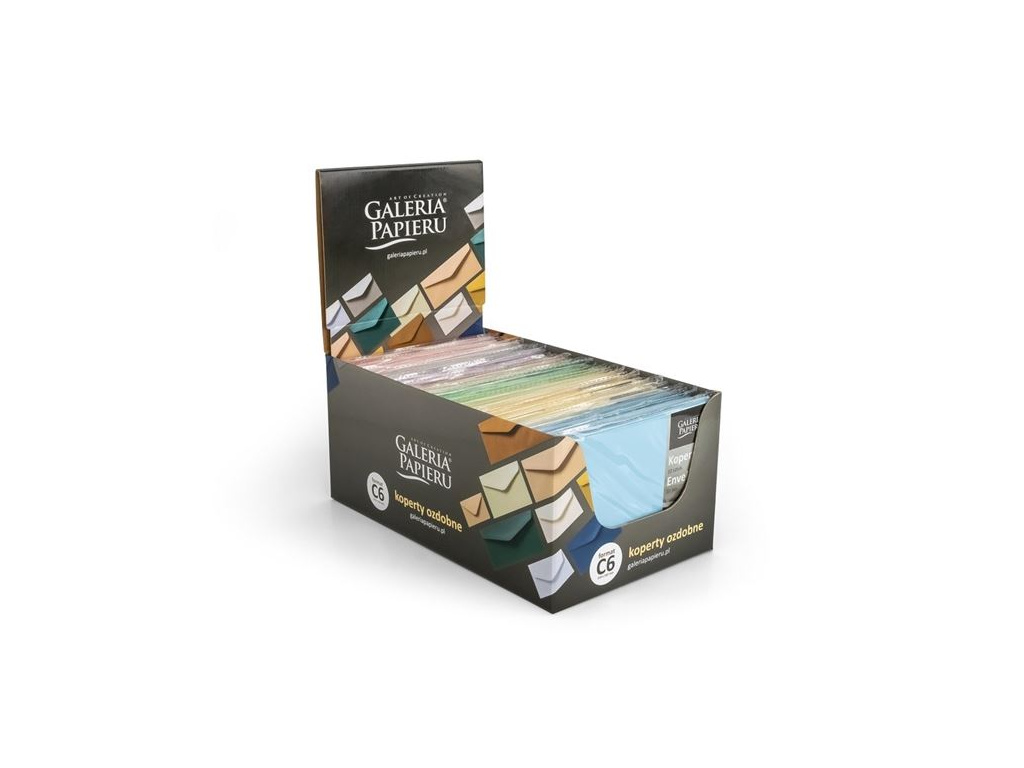 mix obálek v prodejní kartonové krabici (display) formát obálek C6 (114 x 162 mm - vejde se do ní A6, dvakrát přehnutá A4) různé barevné provedení celkem 11 druhů obálek karton obsahuje 45 balení po 10ks obálek (celkem 450ks obálek)Obsah krabice:C6 Mramor zlatá 120g - 4 balení po 10ksC6 Millenium bílá 120g - 4 balení po 10ksC6 Millenium diamantově bílá 120g - 5 balení po 10ksC6 Millenium ivory 120g - 4 balení po 10ksC6 Pearl červená K 150g - 4 balení po 10ksC6 Pearl diamantově bílá K 150g - 4 balení po 10ksC6 Pearl tmavě modrá K 150g - 4 balení po 10ksC6 Pearl světle stříbrná K 150g - 4 balení po 10ksC6 Pearl ivory K 150g - 4 balení po 10ksC6 Pearl zelená K 150g - 4 balení po 10ksC6 Pearl zlatá 120g - 4 balení po 10ksTIPY:Jak se vyznat ve velikostech obálek?Jak obálky a papír kombinovat?