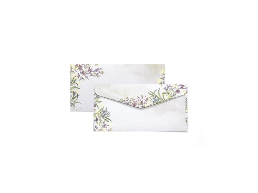 obálka s hladkým povrchem a květinovým motivem výjimečná ozdobnými metalickými prvky vlhčící šípová klopa formát DL (220x110 mm) gramáž 120 g/m2 barva bílá s barevným potiskem balení 10 ks TIPY:Jak se vyznat ve velikostech obálek?Jak obálky a papír kombinovat?