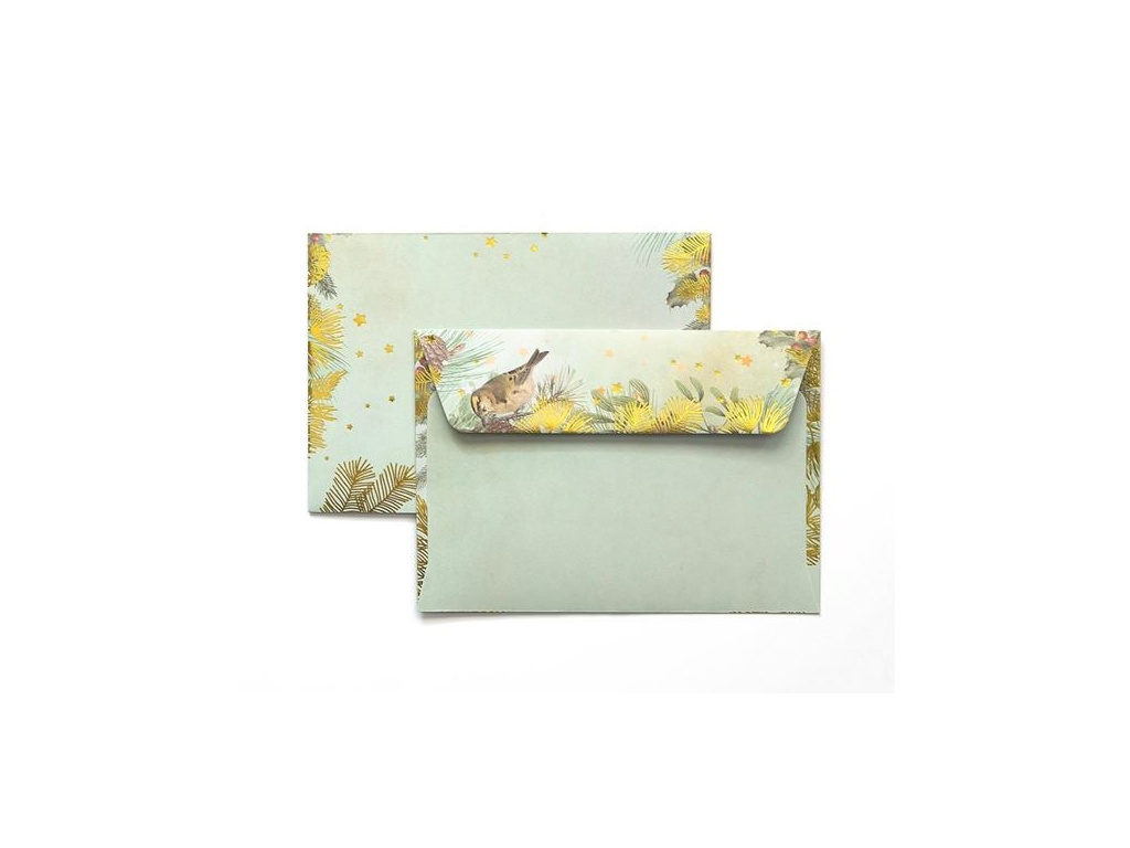 obálka s hladkým povrchem a motivem zimní přírody výjimečná ozdobnými metalickými prvky vlhčící rovná klopa formát C6 (114 x 162 mm - vejde se do ní A6, dvakrát přehnutá A4) gramáž 120 g/m2 barva zeleno-šedá balení 10 ks