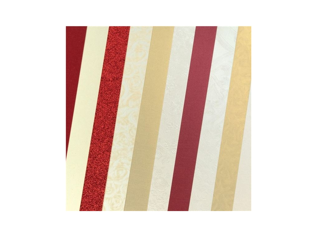 sada 10 kusů různých ozdobných papírů pro kreativní tvoření obsahuje 9 ozdobných papírů (perleťových + hladkých) a 1 třpytivý papír formát A4 gramáž 210 - 250 g/m2 barevné odstíny červené, ivory, zlatébalení 10 ks