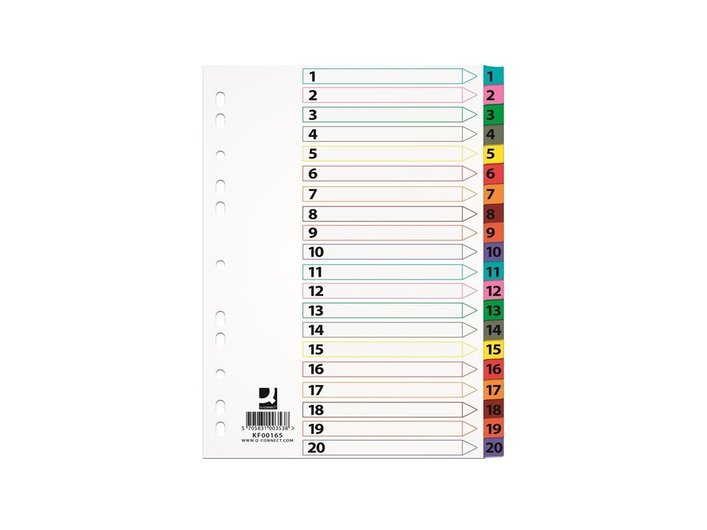 Papírové rozlišovače, vhodné pro organizaci a kategorizaci dokumentů v pořadačiPočet kusů v balení: 20 (číslováno 1 - 20), barevné (2 x 10 barev)Počet děr: 11Tloušťka materálu: 170g Formát: A4