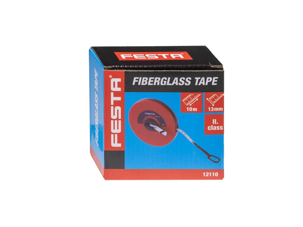 Sklolaminátové pásmo, páska zakončená očkem s gumovou ochranou proti vytrhnutí, sklopná navíjecí ručka, poutko. CE certifikát - metr vhodný ke kalibraci.