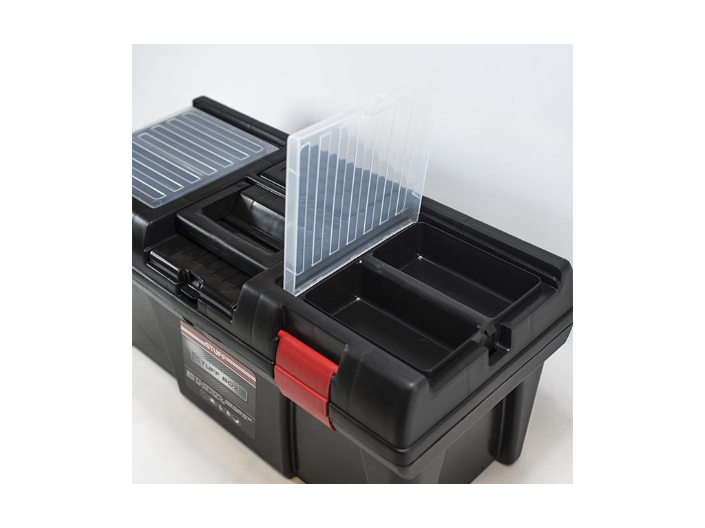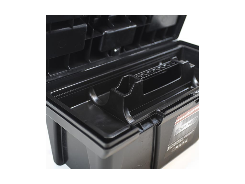 Kufr na nářadí STUFF SEMI PROFI je vyrobený z kvalitního plastu - ve vrchní části jsou dva organizéry pro drobné součástky uzavřené víkem - připraven i otvor pro visací zámek.