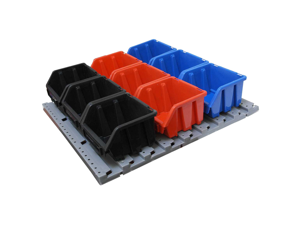 Sada plastových zásobníků na zavěšení do základny, která se připevní na stěnu. Pro přehledné uložení drobného materiálu.