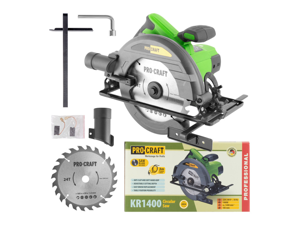 Kotoučová pila Procraft KR1400 je určena k řezání měkkého i tvrdého dřeva a jiných konstrukčních materiálů. Silný motor s výkonem 1400W a vývojem otáček až 5000 zaručuje dlouhou bezporuchovou prací. Regulace hloubky a úhlu řezu umožňuje nastavení optimálních parametrů při práci s různými materiály. Možnost připojení vysavače přes hadici zaručí čisté pracovní prostředí. Součástí dodávky jsou inbusový klíč, uhlíkové kartáče, paralelní doraz a pilový kotouč 185mm. Balení karton.