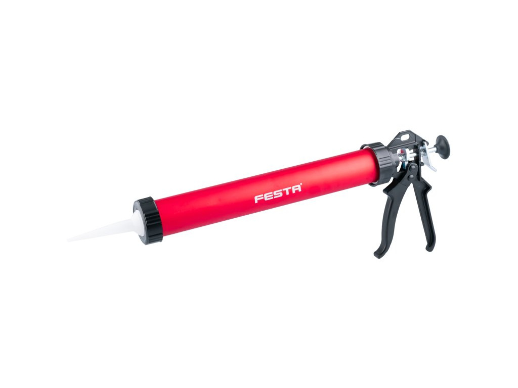 Vytlačovací pistole na tuby 600 ml, uzavřené trubkové Alu tělo, kvalitní zesílený ocelový pojezdový i tlačný mechanismus, odolná kovová ručka, náhradní špičky - aplikátory 38014, použití : pro vytlačování tmelů v PVC sáčcích 600ml.