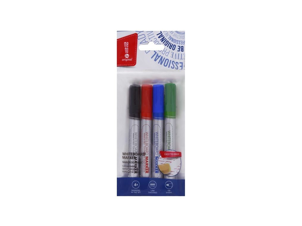Sada popisovačů vhodných k popisu tabulí stíratelných za sucha (lakované, keramické, sleněné tabule)Inkoust se slabým zápachem na bázi alkoholuŠíře stopy: 2,0 - 3,0 mmKulatý hrotSada obsahuje 4 popisovače: černý, červený, modrý, zelený