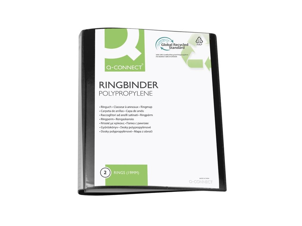 Barevný polypropylenový kroužkový pořadač3 kapsy - přední, hřbetní a vnitřní rohováŠíře hřbetu: 2,6 cmTyp mechaniky: O-mechanikaPrůměr kroužku: 19 mmPočet kroužků: 2Kapacita: 150 listůMateriál: PPTloušťka materiálu: 700 micBarva: černá