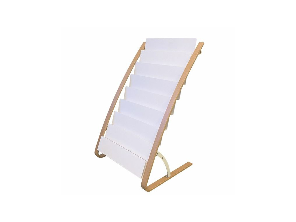 elegantní prezentační stojan na tiskoviny stabilní kovová konstrukce s 4 protiskluzovými podložkami rám dřevo + bílý ABS plast vhodný pro formát dokumentů A4 8x2 velkých přihrádek na dokumenty 24x32 cm, tloušťka 4 cm rozměry stojanu: 58 x 93 x 50 cm snadná montáž ZÁRUKA: 24 měsíců