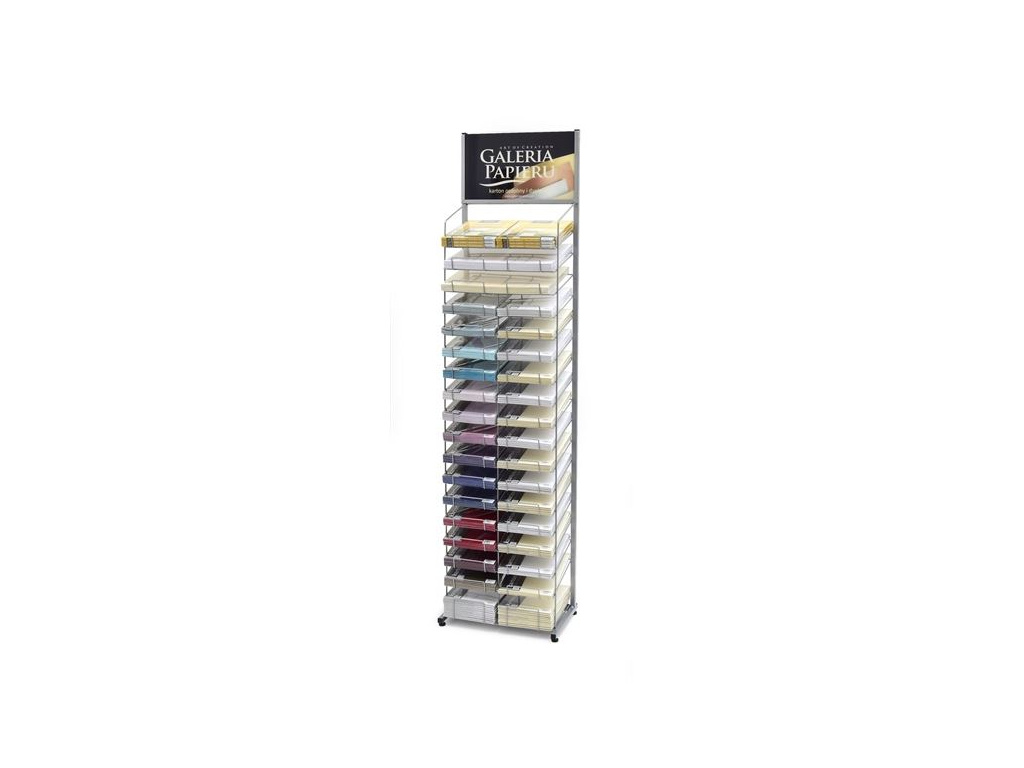 Prázdný stojan pro vystavení papírů a diplomů Stabilní konstrukce s protikluzovými nožkami 36 (2x18) přihrádek pro formát A4 Rozměr přihrádky: 22 x 31 cm (výška 10 cm) Kapacita přihrádky 7 balení papíru A4 nebo 5 balení diplomů Barva: stříbrnošedá Rozměry: 48,5 x 33 x 195 cmStojan slouží výhradně k podpoře prodeje a propagaci výrobků značky Galeria PapieruV případě zájmu kontaktujte obchodní zástupce