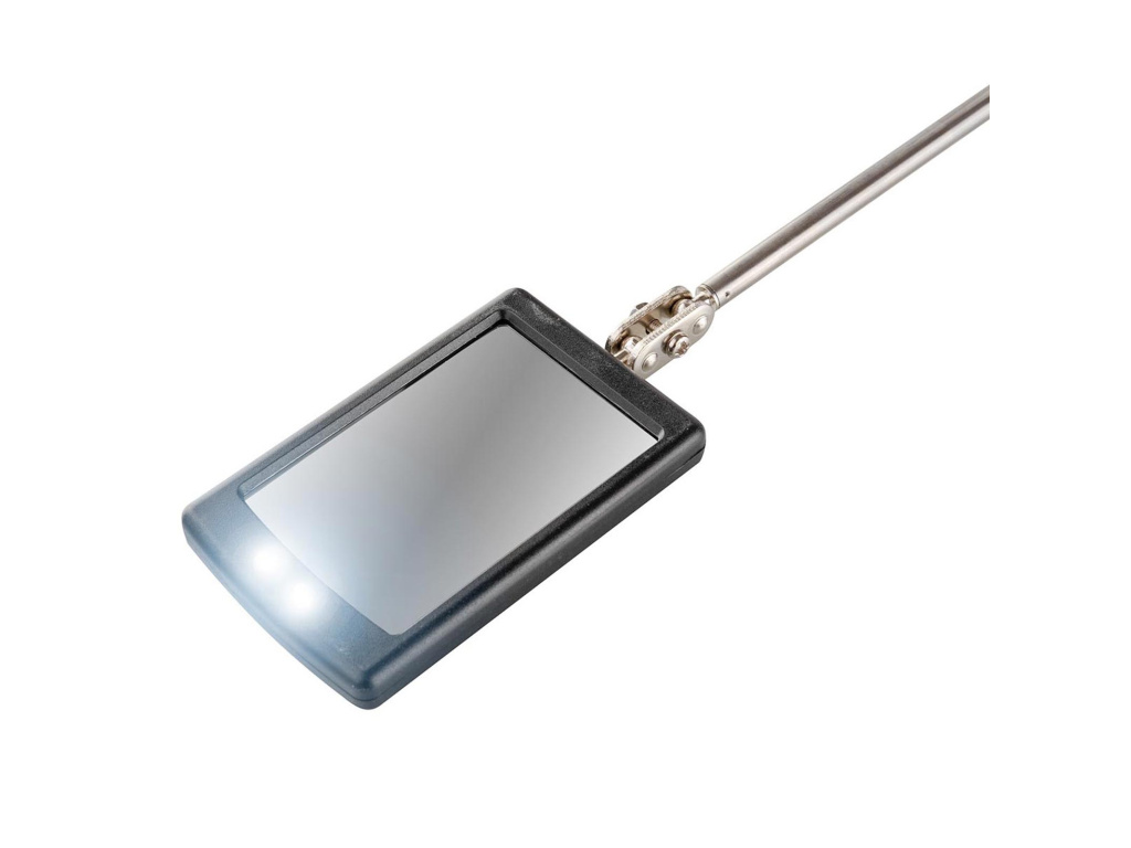 Obdélníkové teleskopické inspekční zrcátko s LED osvětlením umožňuje viditelnost v těžko přístupných a tmavých místech. Zrcátko je možné teleskopicky vysouvá v rozmezí 280 - 870 mm. Je vybaveno dvěma LED diodami napájenými dvěma bateriemi CR2032 (jsou součástí balení). Kloub umožňuje širší rozsah nastavení úhlu. Ergonomická protiskluzová plastová rukojeť.