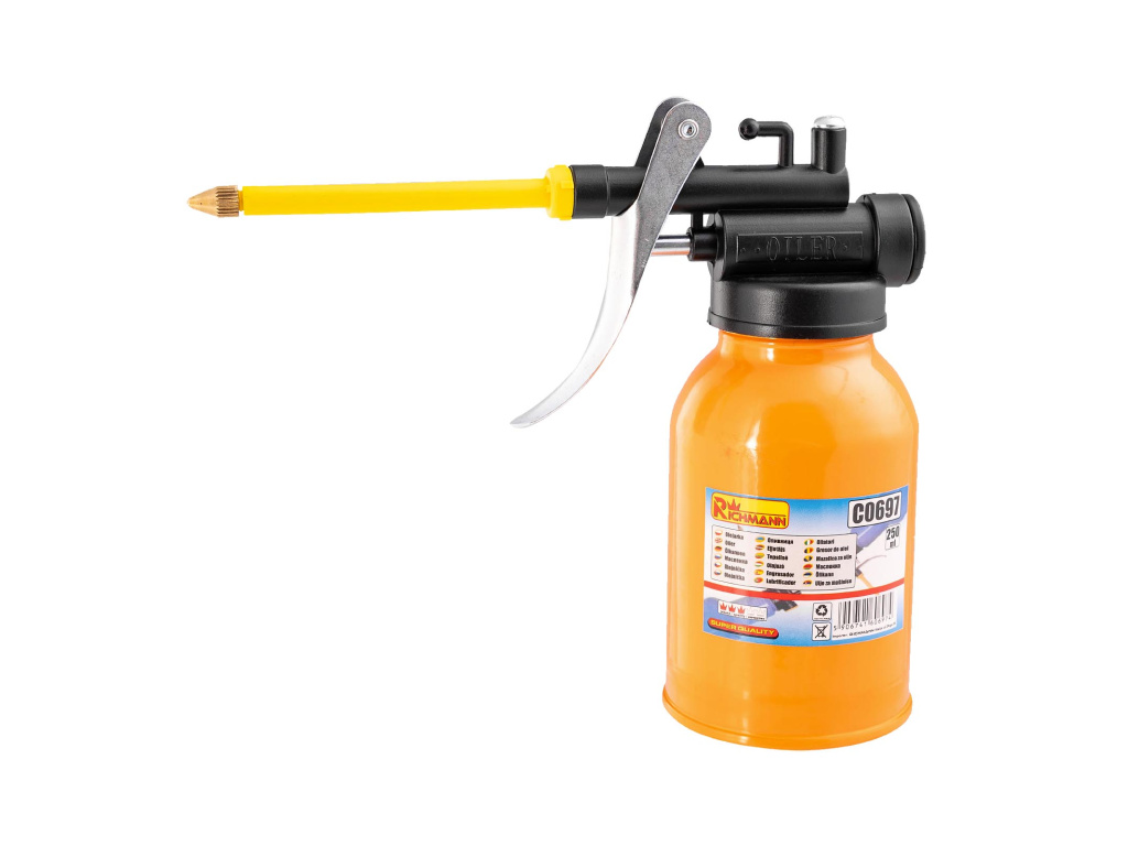Olejnička s objemem 250 ml je nepostradatelný nástroj v každé profesionální i domácí automobilové dílně. Plechová nádoba potažená lakem na ochranu před vnějšími vlivy. Pružný aplikátor umožňuje olejování v těžko přístupných místech. Kovová tryska zaručuje spolehlivý dlouhodobý provoz. Spoušť umožňuje kontrolované přesné rozdělování obsahu.