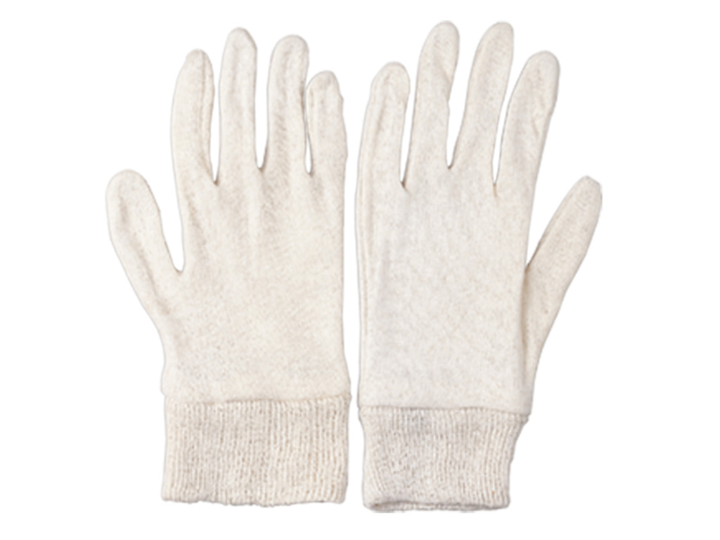 Pětiprsté rukavice šité z jemného režného bavlněného úpletu s pružným nápletem na zápěstí. velikost: univerzální