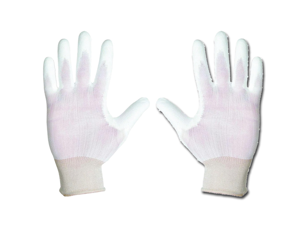 Bezešvé bílé rukavice z jemného nylonu, pružná manžeta, dlaň a prsty pokryté tenkou vrstvou polyuretanu.