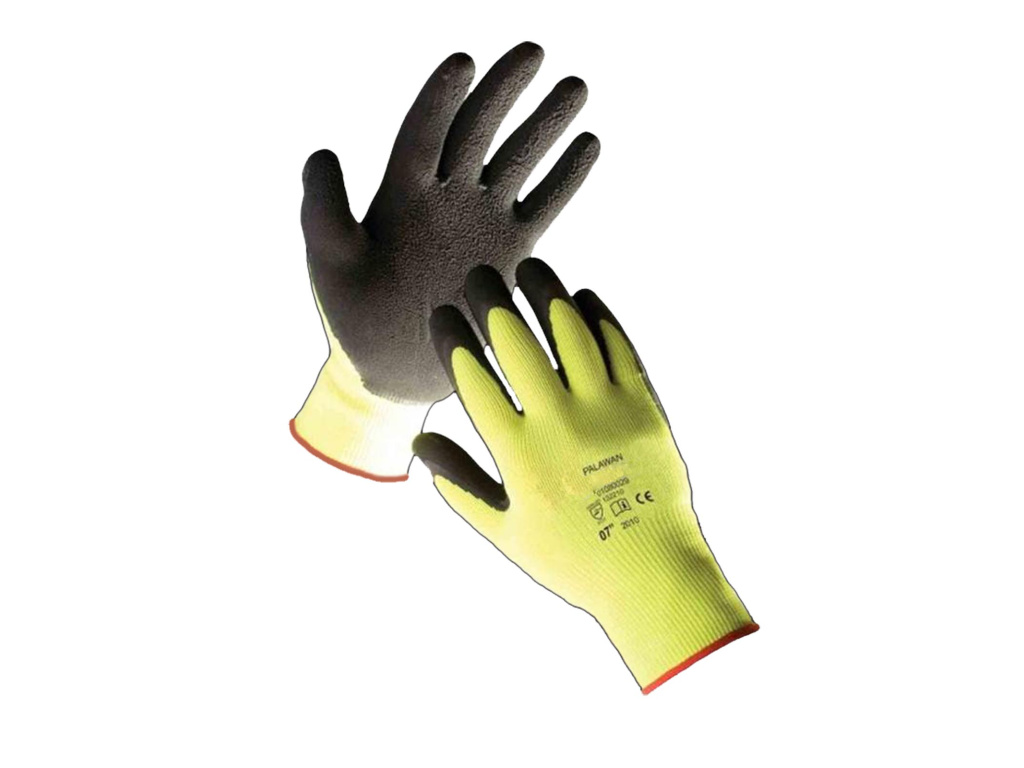 Zateplené pletené bezešvé nylonové rukavice s vrstvou mikroporézního paropropustného latexu v dlani a na prstech a pružným nápletem na zápěstí.