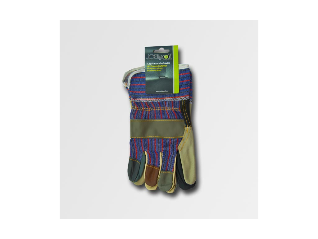 Kombinované rukavice, dlaň z různobarevné lícové nábytkové hověziny, hřbet a manžeta z pruhované bavlněné tkaniny, podšívka ve dlani.