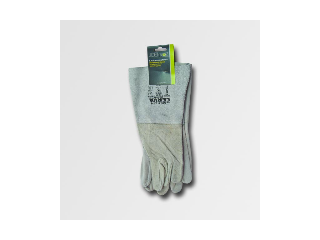 Celokožené rukavice z šedé hovězí štípenky, tuhá manžeta 15cm, bez podšívky – certifikát pro svářečské práce.