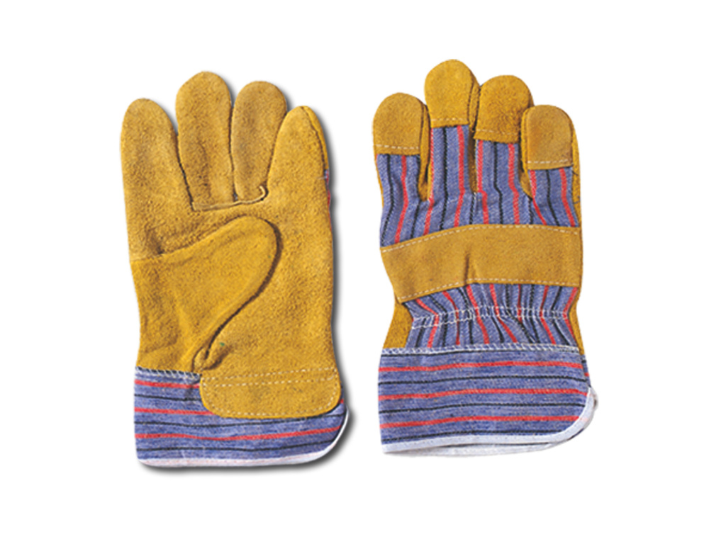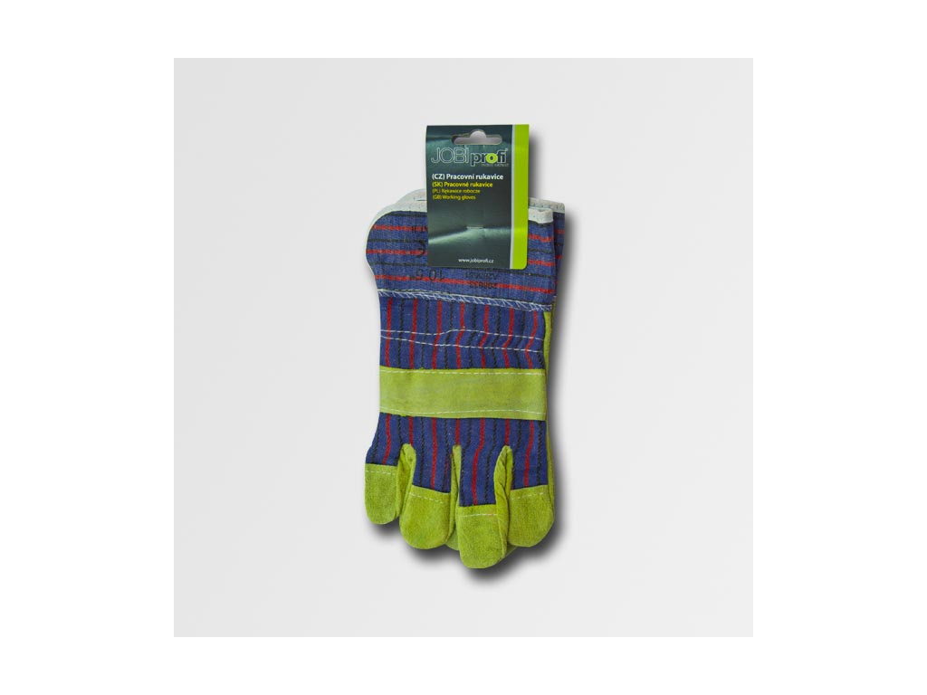 Kombinované pánské rukavice, dlaň ze žluté hovězí štípenky, s bílou tkaninou na hřbetu, podšívka ve dlani.