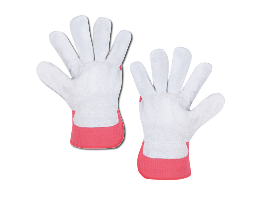 Kvalitní oranžová hovězí štípenka, hřbet z červené bavlny, teplá podšívka, vyztužená manžeta