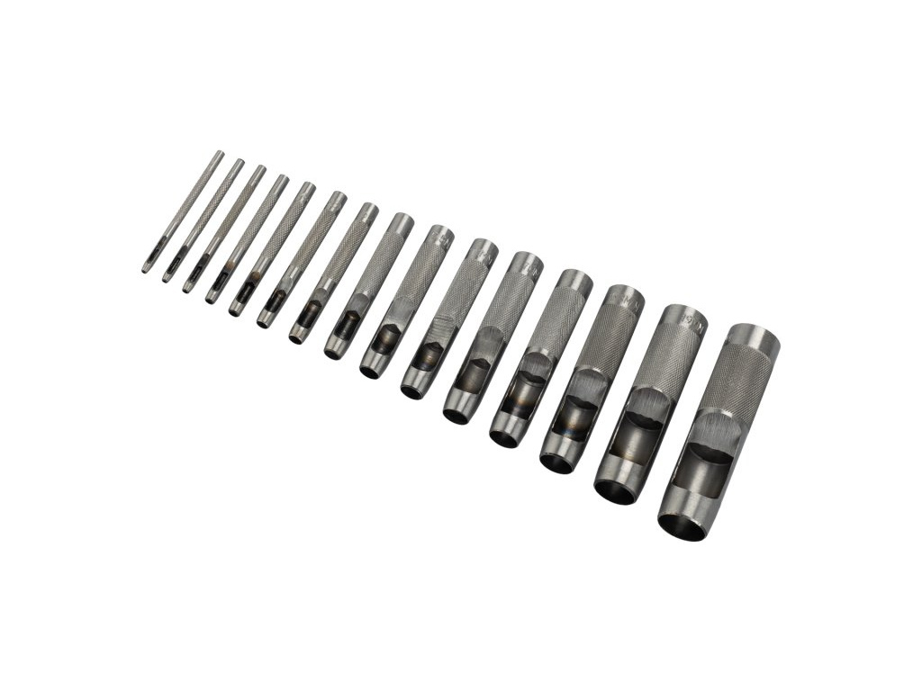 Ocelové děrovače na kůži. Děrovače jsou opatřeny bočním výhozem odpadu. Sada 15ks. Průměry děrovačů: 2mm, 2,5mm, 3,2mm, 4mm, 4,8mm, 5mm, 6,4mm, 8mm, 9,5mm, 11,1mm, 12,7mm, 14mm, 15,8mm, 19mm, 22mm.