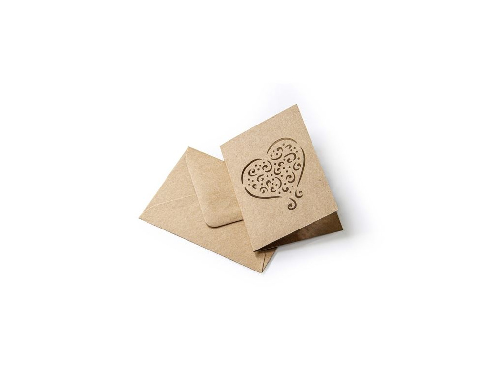 výsek ve tvaru srdce přání z tvrdého karftového papíru vlhčící šípová klopa rozměr obálky 70x100 mm barva kraft tmavě béžová balení obsahuje 5 přání + 5 obálek