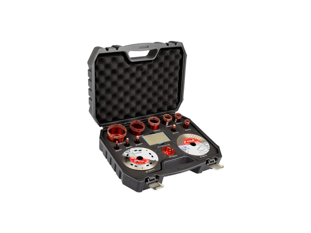 - speciálně sestavená sada diamantových nástrojů - vrtací, vykružovací, brusné korunky, řezné a brusné kotouče, brusná houba pro profesionální obkladačské práce