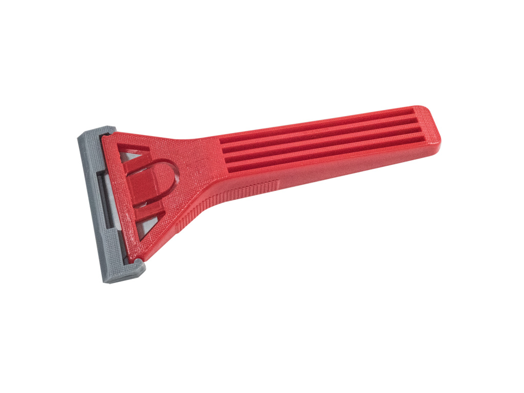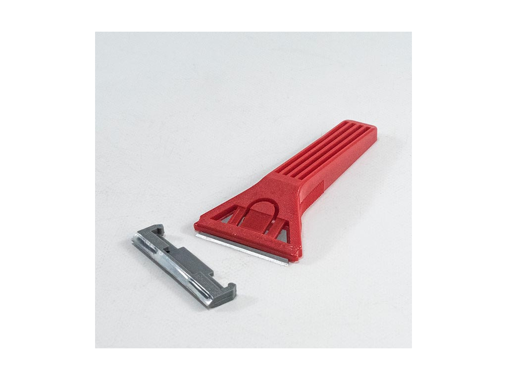 Plastová škrabka s velice ostrým břitem pro odstraňování nálepek a nečistot ze skla a hladkých materiálů.
