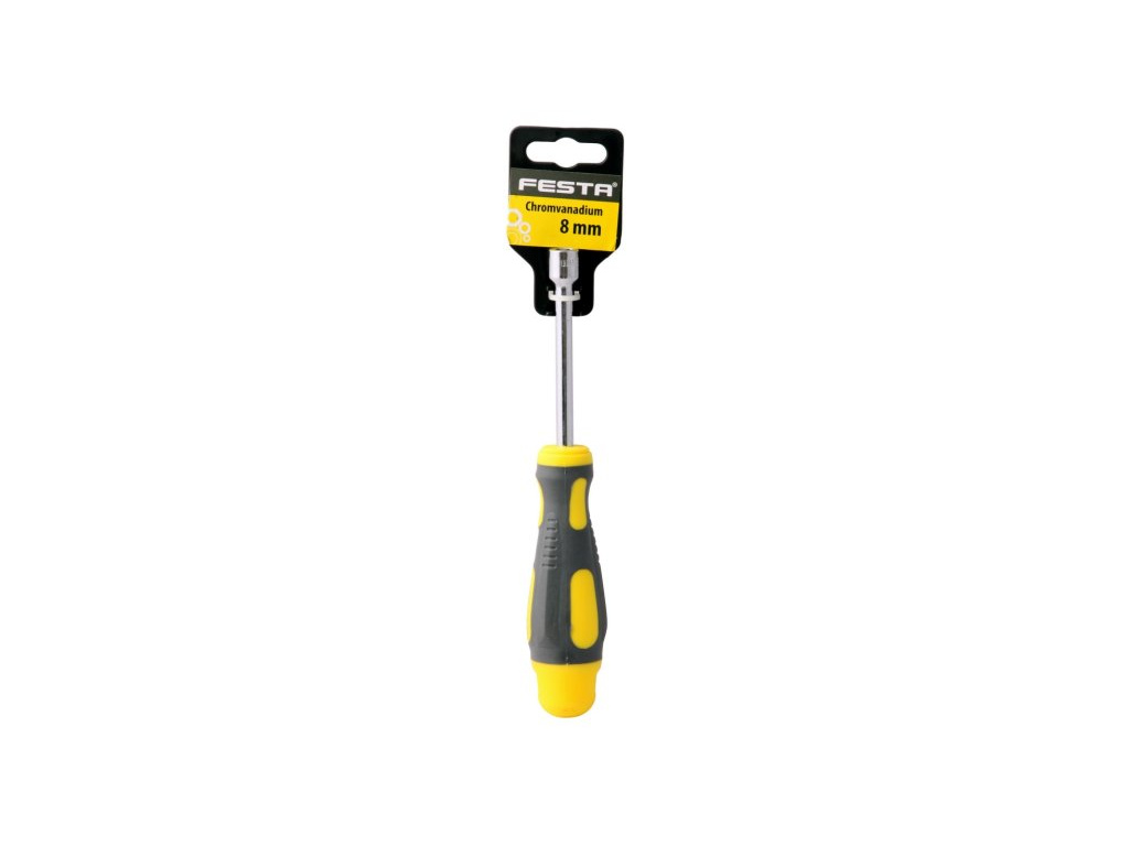 Nástrčný šroubovák FESTA má kovový dřík s nástavcem vyroben z velmi kvalitní chromvanadiové oceli , povrchově chráněný tvrdochromem, kombinace polypropylenu a pryže na ergonomicky tvarované rukojeti zaručuje výborné antiskluzové vlastnosti a dobrou odolnost vůči mazadlům a chemikáliím.