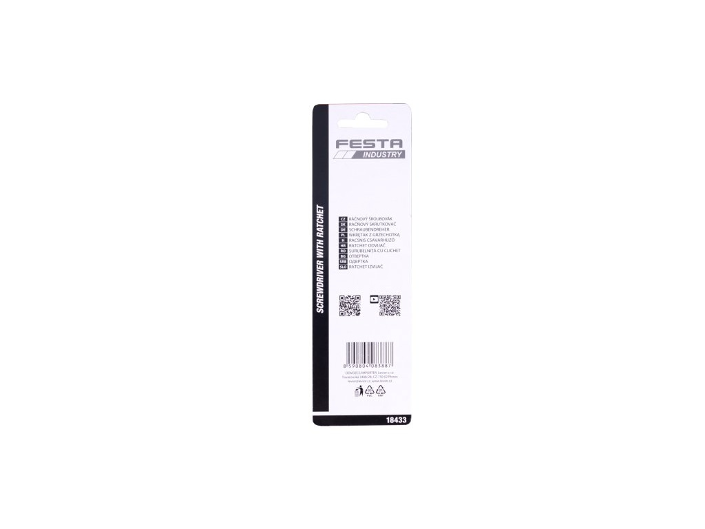 Ráčnový šroubovák s držákem bitů 1/4, CrV, ergonomická dvoukomponentní měkčená rukojeť, otvor pro páku, magnetická koncovka.
