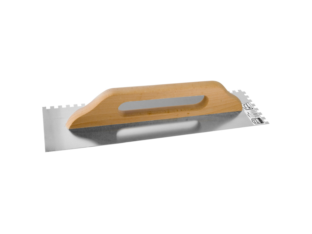 Nerezové hladítko s dřevěnou rukojetí, vhodné pro nanášení lepidel, malty atd.