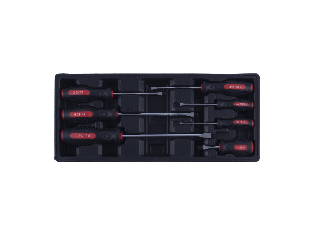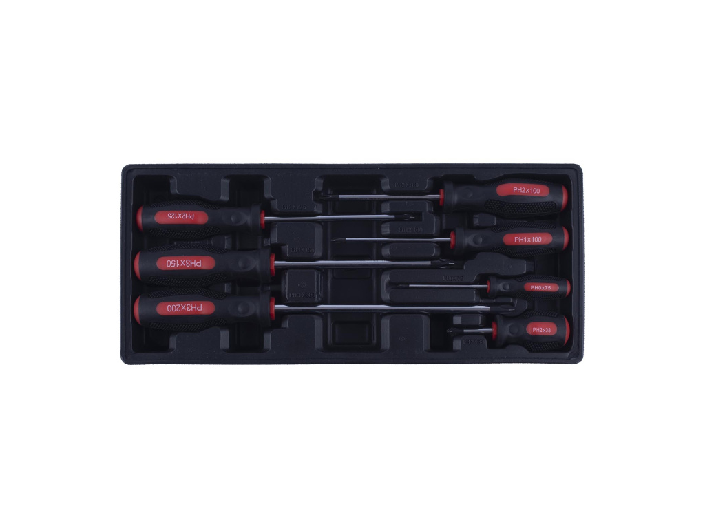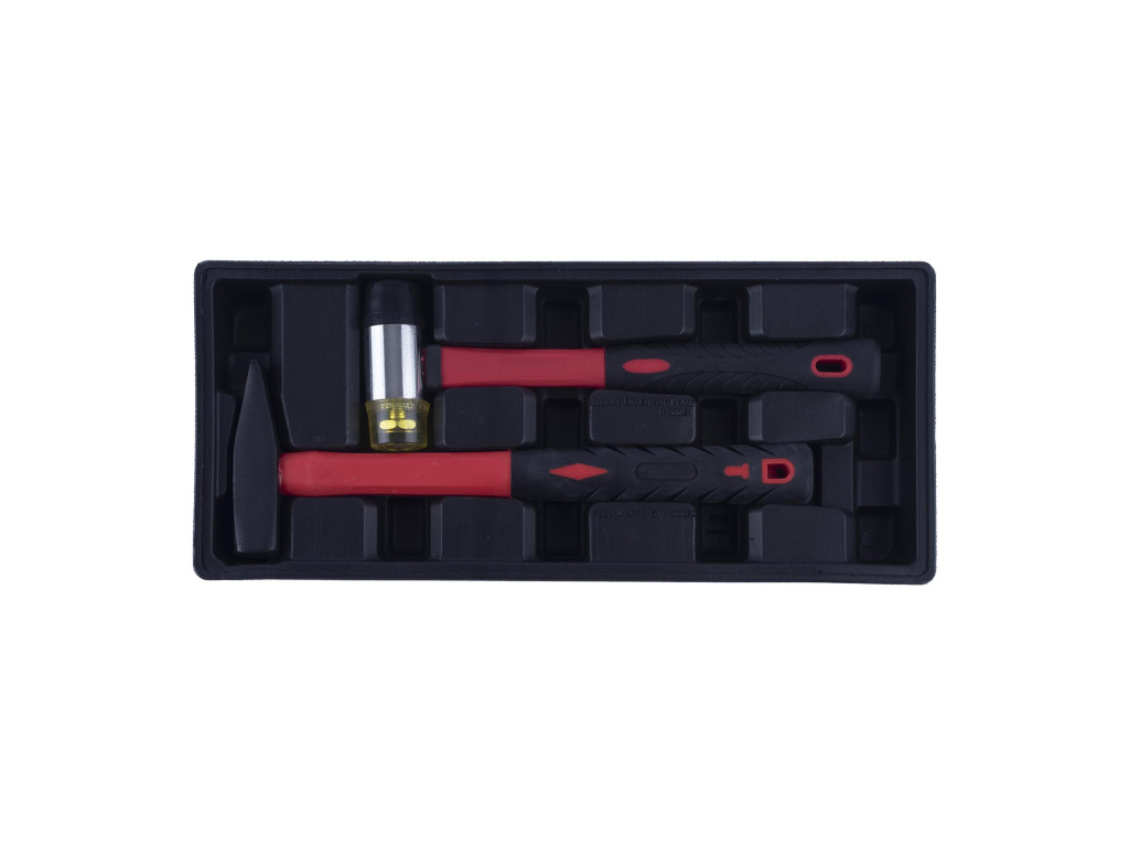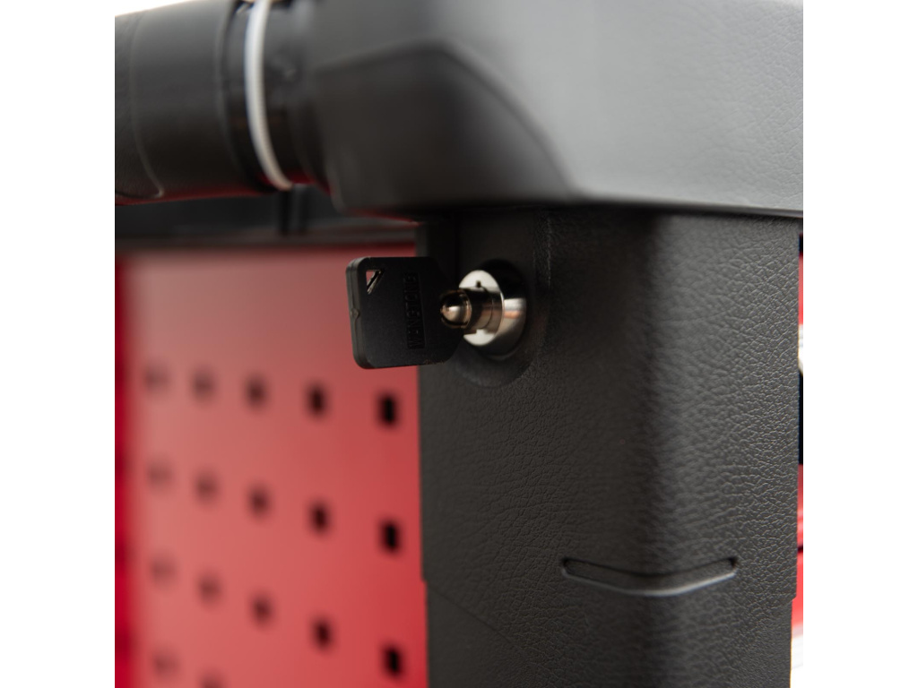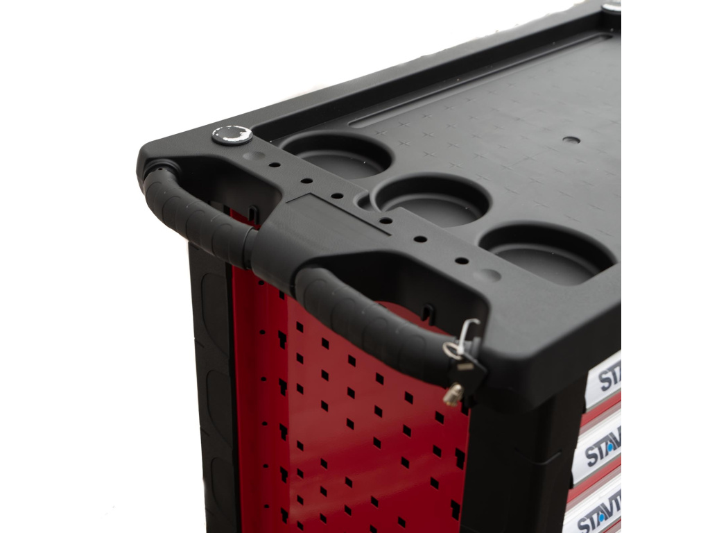 Kovový montážní vozík na nářadí se 7 zásuvkami. Dvě pevná a dvě otočná kolečka s poziční brzdou. Zásuvky na kuličkových ližiskách lze vysunout 40cm. horní pracovní plocha i zásuvky jsou vypodloženy protiskluzovou podložkou. Držadlo pro manipulaci s vozíkem lze umístit z pravé nebo levé strany. uzamykatelné zásuvky. 5 nízkých a 2 vysoké zásuvky.