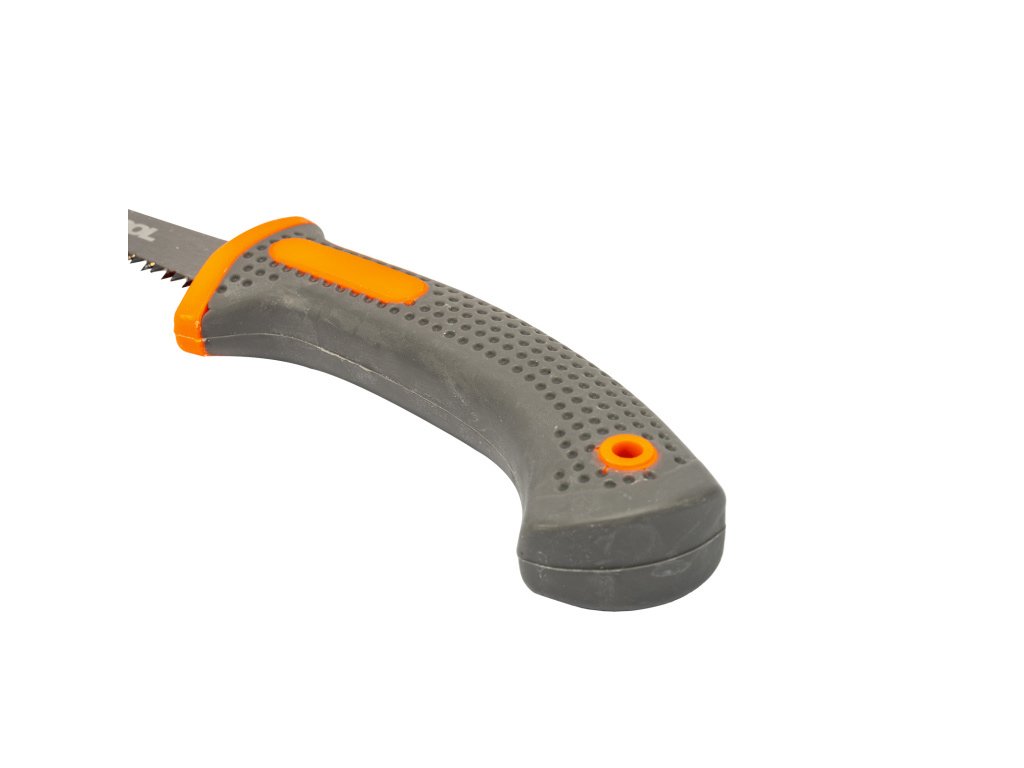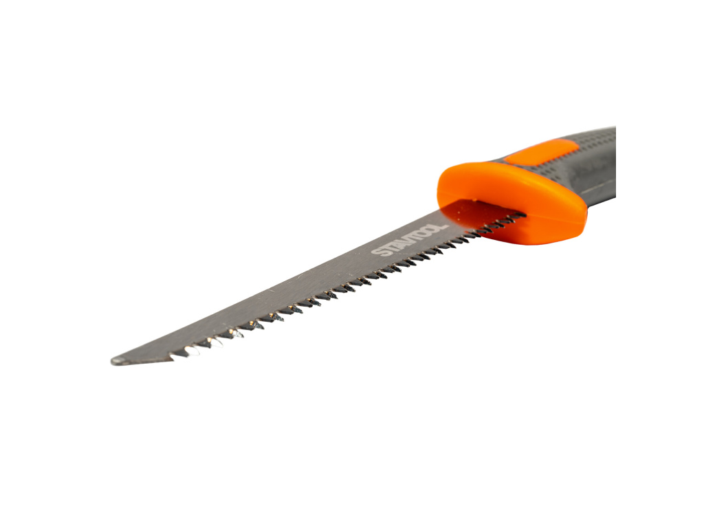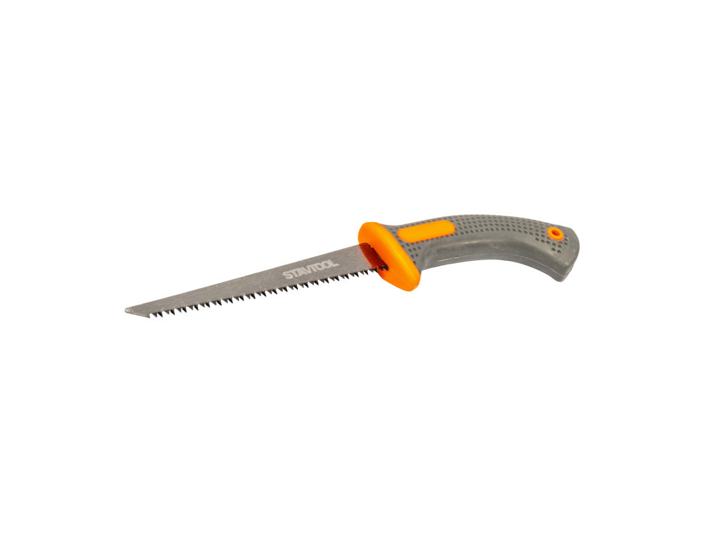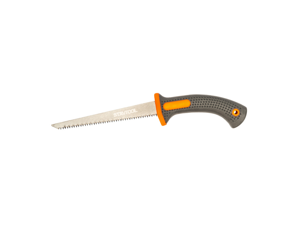 Ruční malá pilka na dokončovací práce se sádrokartonem, dvousložkové držadlo, tenké zúžené ostří, ozubení až po hrot listu.