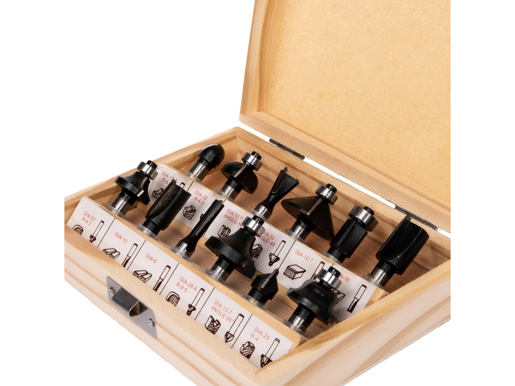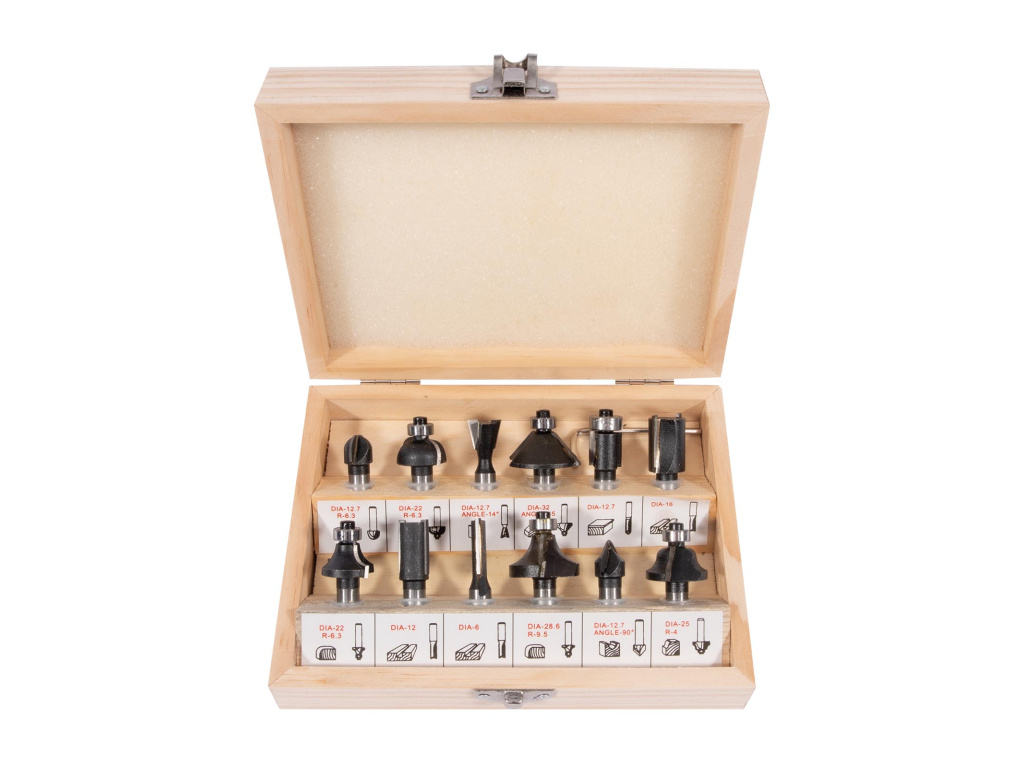 Tvarové frézy pro horní frézu v dřevěné kazetě.