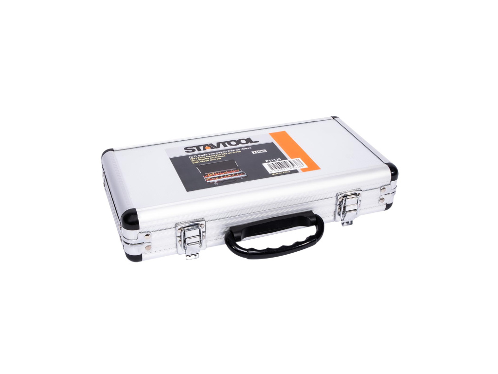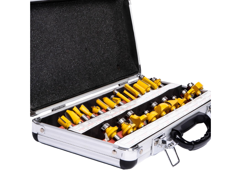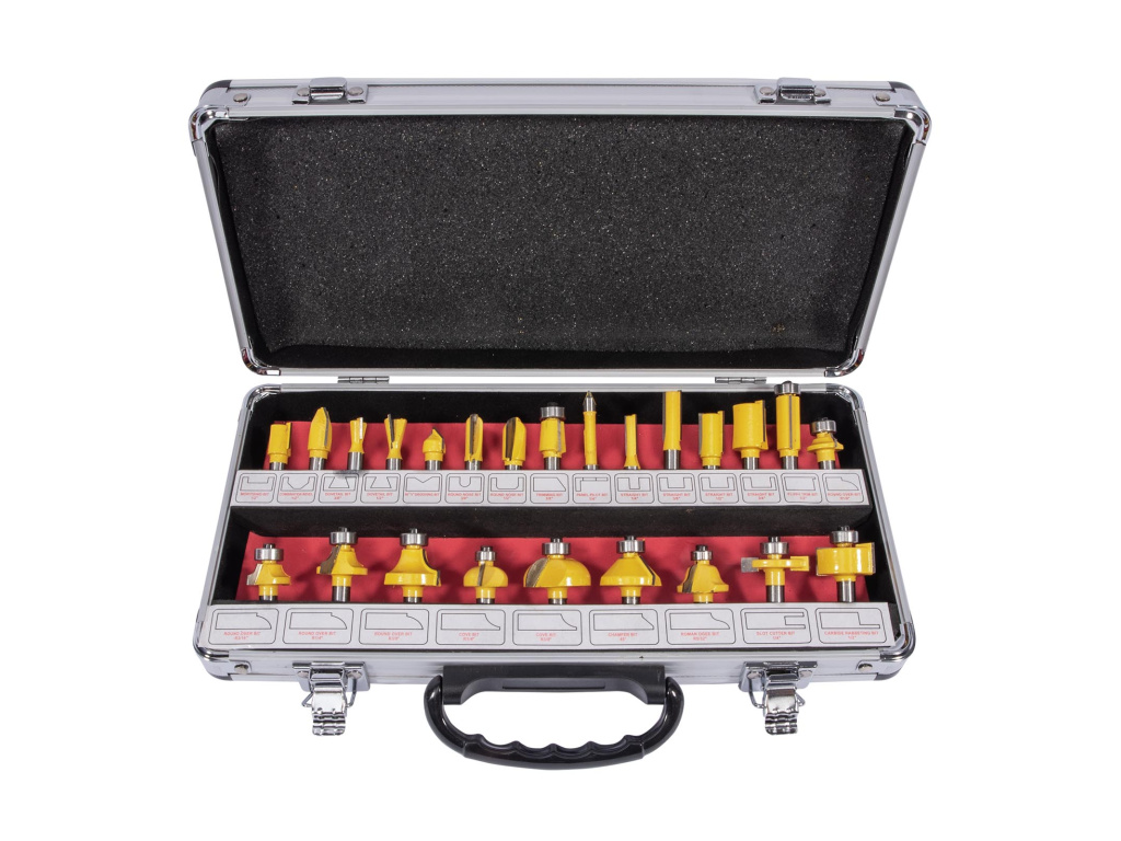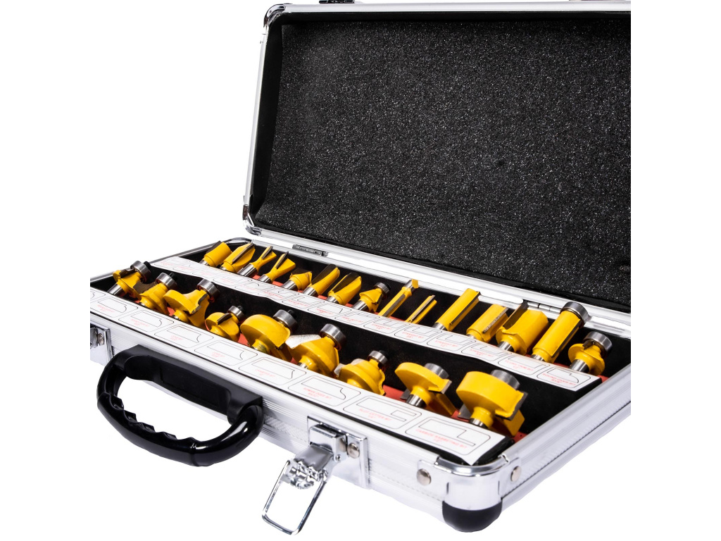 Tvrdokovové tvarové frézy pro horní frézky v hliníkovém kufříku s přehledným uložením.