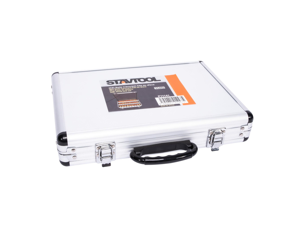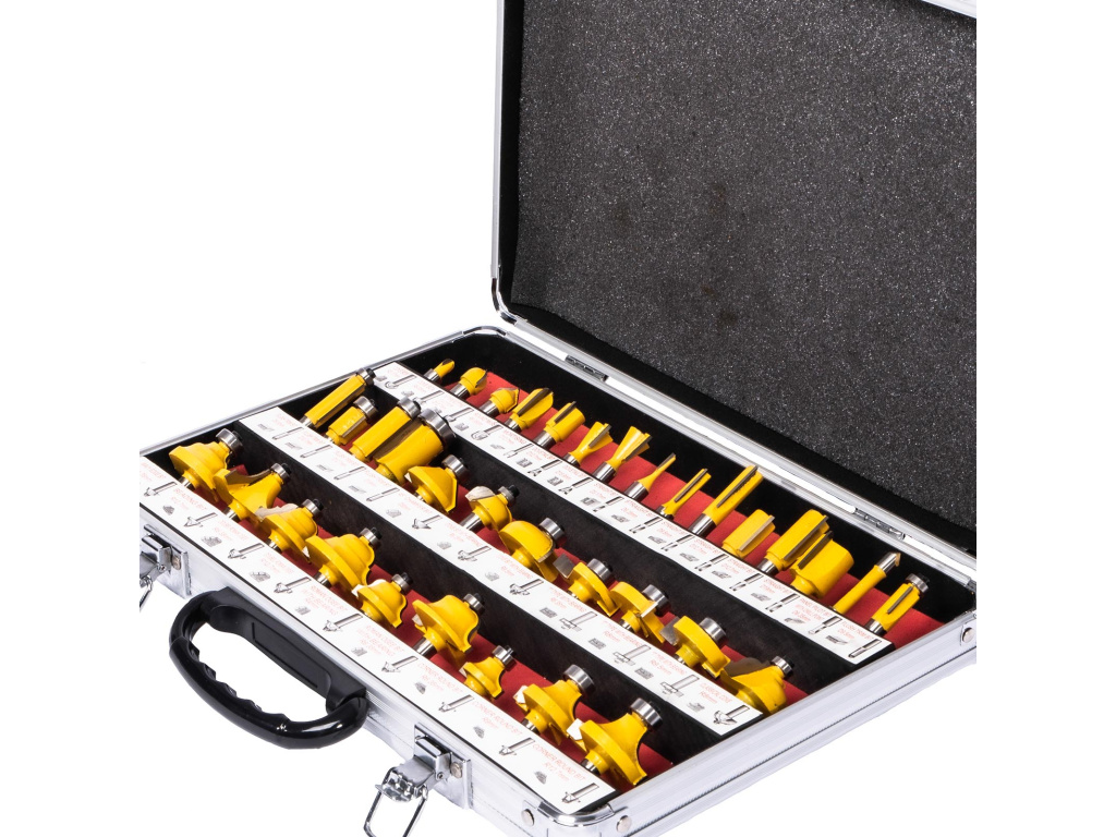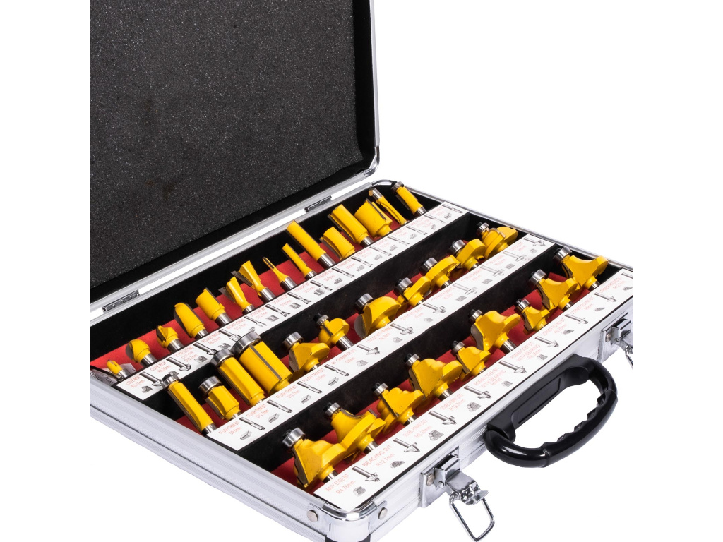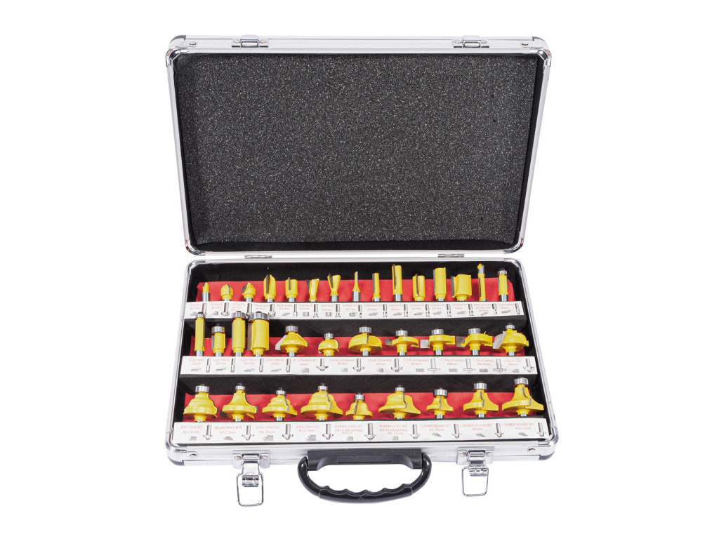 Tvarové frézy pro horní frézu v hliníkovém kufříku.