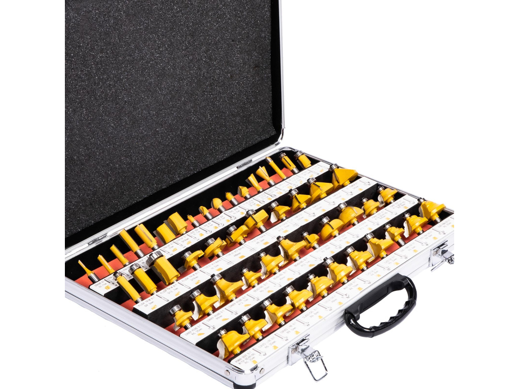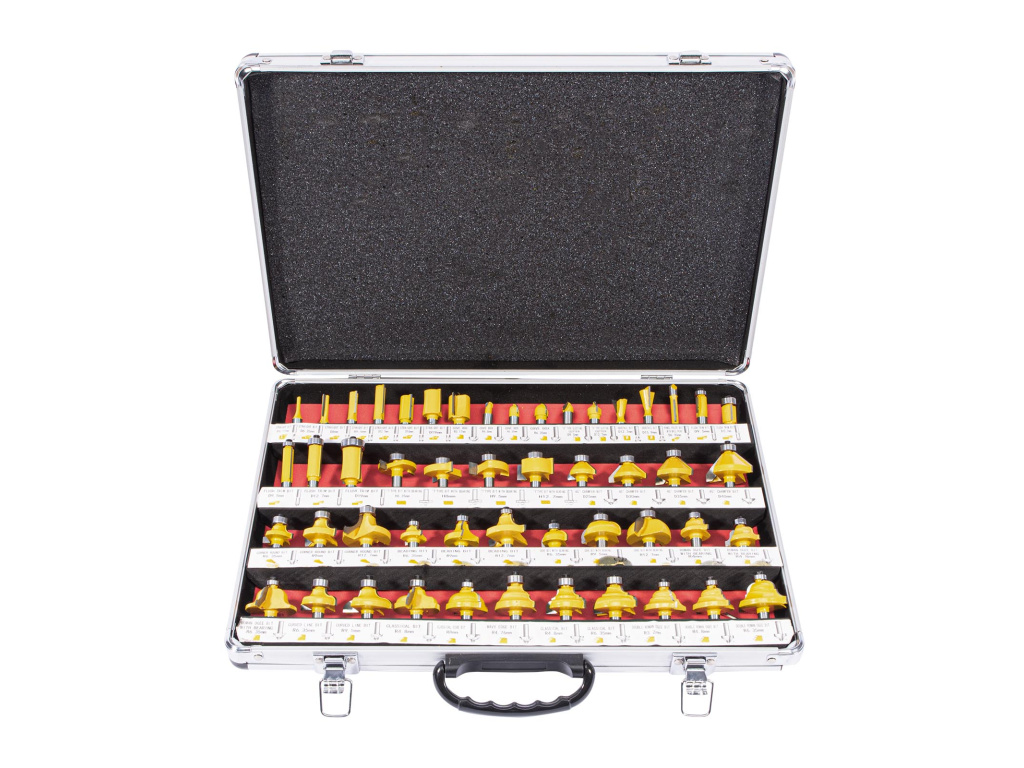 Tvarové frézy pro horní frézu v hliníkovém kufříku.