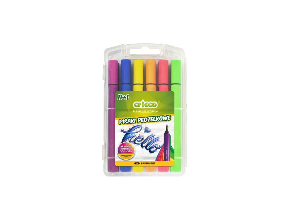 popisovač se štětcovým hrotem ze syntetických štětin měkký hrot ve tvaru štětce umožňuje příjemné a přesné vybarvování popisovače mají kulatý tvar s ergonomickým úchopem sada obsahuje 11 barevných štětcových popisovačů + 1 popisovač s tvrdším hrotem ke kreslení kontur vhodné pro kreslení, základy kaligrafie, bullet journal a jiné kreativní projekty inkoust je pigmentový, není světlostálý popisovače jsou uloženy v praktickém pevném plastovém pouzdře