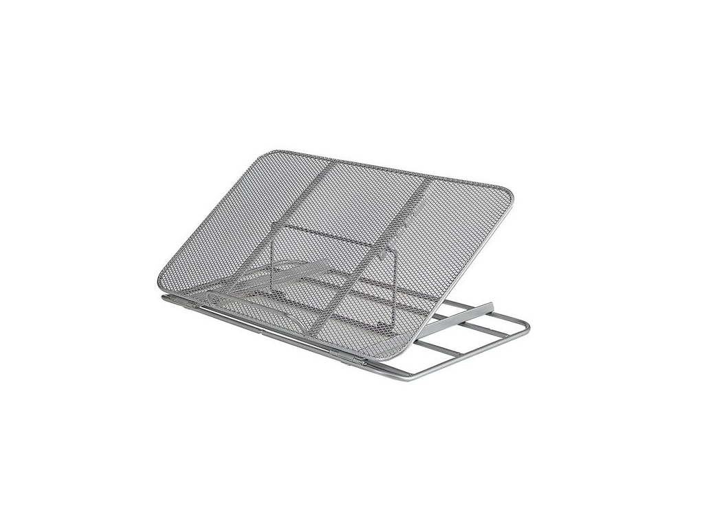 podstavec umožňuje umístění obrazovky v úrovni očí 5 úrovní sklonu pro pracovní komfort vhodné pro počítače od 15" do 17" drátěná konstrukce zajišťuje ventilaci notebooku lze snadno složit na plocho materiál: kov, kovová síťovina barva: stříbrně šedá rozměry: 35 x 22 x 2-14 cm