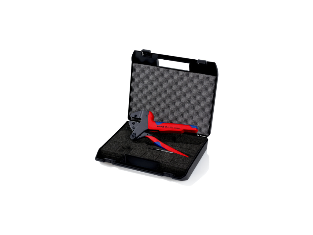 Kleště 97 43 200 s montážním nářadím (klíč na vnitřní šestihrany, otevřený klíč), šrouby a maticemi v plastovém kufru. Pěnová vložka s vybráními k přechovávání lisovacích profilů a polohovacích pomůcek.