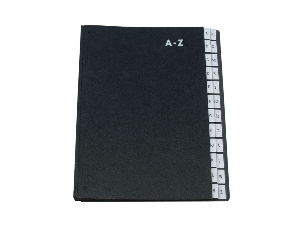 Třídicí knihaPro organizaci a třídění dokumentůMateriál: ražený kartonPružný hřbetVnitřní listy s děrovánímJednostranný potiskFormát: A4Rejstřík: A-ZBarva: černá