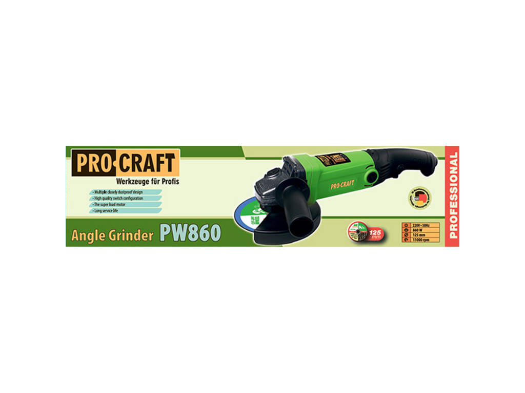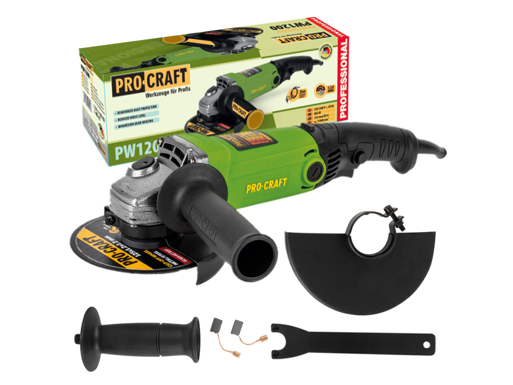 Bruska úhlová Procraft PW1200 Součástí balení: uhlíkové kartáče, montážní klíč Příkon: 860W Průměr kotouče: 125mm Otáčky: 0-11000/min Vřeteno: M14 Hmotnost: 2kg