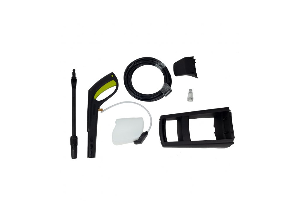 Součástí balení: vysokotlaká hadice, láhev na čistící prostředek, spouštěcí pistole, rozstřikovací násada, variabilní tryska (s nastavením tlaku), přípojka přívodu vody, čistící špička trysek, upevňovací prvky (sada).