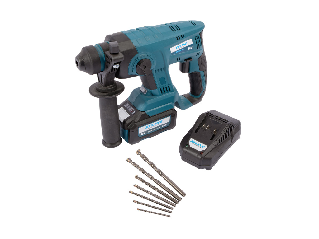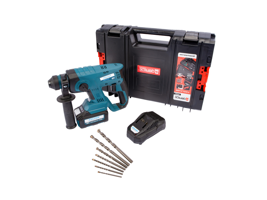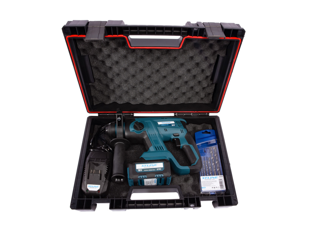 XTLINE Aku kladivo SDS PLUS + baterie 5.0 Ah + sada vrtáků + nabíječka 3.5 A + kufr