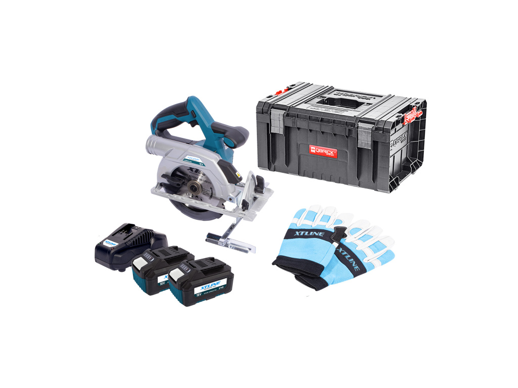 XTLINE Aku kotoučová pila bezuhlíková 18 V, 165 mm + 2 baterie 5.0 Ah + nabíječka 3.5 A + rukavice + box